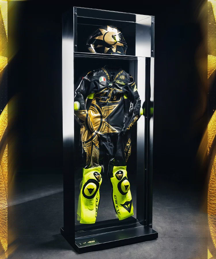 To celebrate this special birthday, Dainese and AGV present an unprecedented combination – the Demone GP D-air® 3x suit and the Pista GP RR helmet, featuring the spectacular Soleluna Vale46 Anniversario graphics, specially created as a gift to Vale. A blend of the unmistakable fluorescent yellow hue, jet black color and gold-leaf details. Colors that narrate a career built on emotions and legendary victories. More than mere suit-helmet gear – an exclusive and precious collector’s kit, dedicated to fans all over the world.